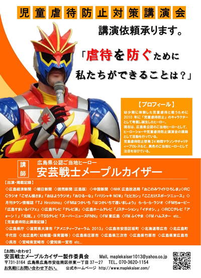 幼少期に体験した児童虐待と戦うために2010年に「児童虐待防止」の啓発キャラクターとして考案し誕生したヒーロー。